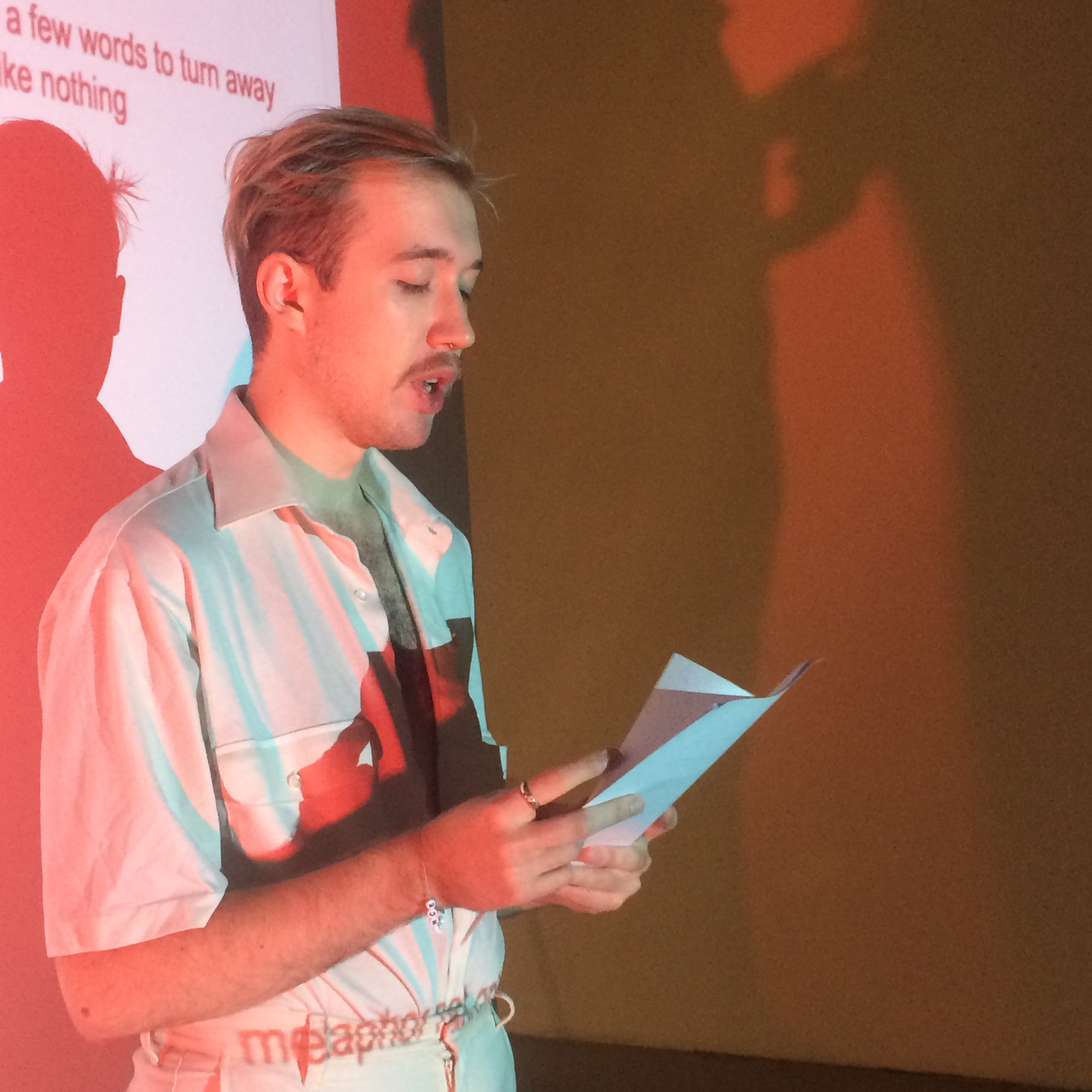 « Je me comprends un peu plus comme artiste, et je vois le mot comme médium. Alors j’écris de la poésie sur la page, je fais de la performance et je m’intéresse aussi à l’installation. » (…)» Il précise même que « avec le Collectif Sans-atelier, j’ai eu la chance de présenter une installation il y a quelques années à AKA Artist-Run Centre à Saskatoon. Je travaille toujours avec ce collectif pour épanouir les possibilités de la littérature ». En effet le Collectif Sans-atelier a eu le grand plaisir de travailler avec Alasdair pour la présentation d’une performance (lecture de textes choisis et performés par Alasdair) et d’une installation conçue par ce dernier qui s’intitulait La maison hantée. Ces deux interventions faisaient partie du projet Re:vision 2, présenté à AKA Artist-Run Centre à Saskatoon en 2016. Il nous fait grand plaisir de faire partie du cheminement créatif et artistique de cet artiste prometteur.